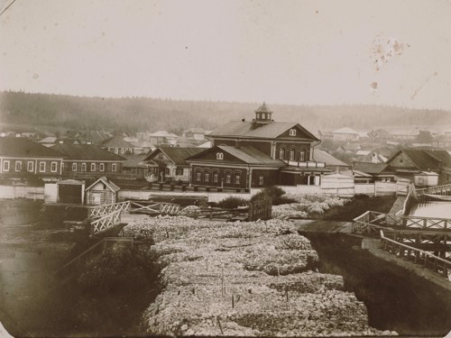 На фотографии слева стоит большой дом семьи Балдиных, семья занималась торговлей. Дом сгорел при артиллерийском обстреле во время гражданской войны, в июне 1919 года. За домом Балдиных видна крыша первого здания мужского училища, после постройки нового здания мужского училища здесь располагалось женское училище.