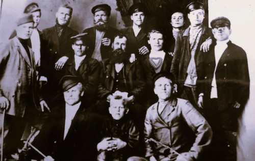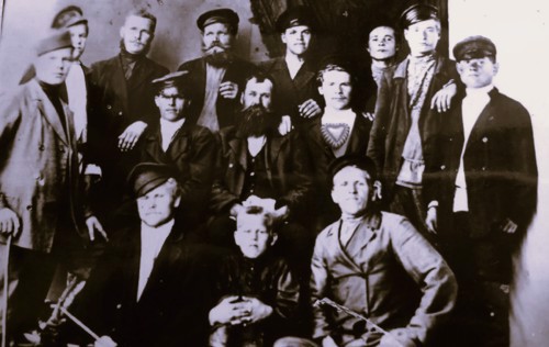 Рис. 2 Мастеровые Кувинского завода, "сердечком" отмечен Щукин Петр Кондратьевич, фотография из архива Ермаковой Л. Ю.