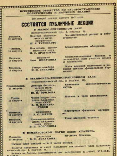 Рис. 7 Газета "Вечерняя Москва" от 8 августа 1947 года о лекциях