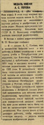 Рис. 6 Газета "Вечерняя Москва" от 6 мая 1948 года о награждении В. П. Вологдина
