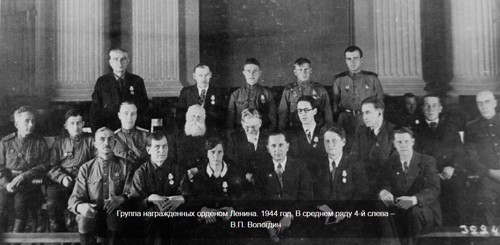Рис. 5 Вологдин В.П. (во 2 ряду 4 слева) среди группы награжденных орденом Ленина, 1944 год. На фотографии присутствуют Калинин М. И. и Левитан Ю. Б.