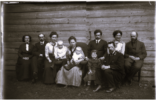 Слева направо: Балдина (Теплоухова) Нина Федоровна, Балдин Иван Иванович, Вологдина (Теплоухова) Мария Федоровна с сыном Всеволодом, Корьюс Амалия с сыном Балдиных - Леонидом, Теплоухов Александр Федорович с Валерией Вологдиной, Зеленина (Теплоухова) Анна Федоровна, Вологдин Валентин Петрович, на переднем плане Зеленин Алексей Несторович. Фотография, предположительно, сделана в Ильинском перед 1 Мировой войной.