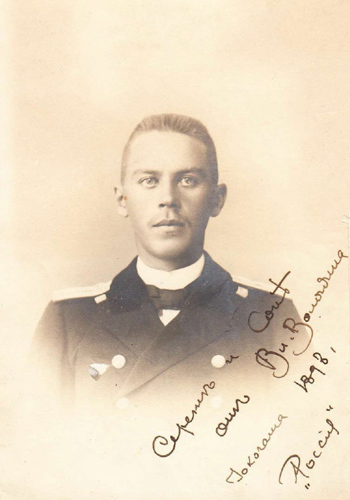 После переезда семьи в Пермь учился в реальном училище, окончив которое, поступил в Кронштадтское инженерное училище императора Николая I. В конце 1890–х годов совершил переход на крейсере «Россия» в первом составе экипажа этого крейсера, исполняя обязанности младшего механика. В книге внука Виктора Петровича есть информация, что Владимир Петрович плавал на этом крейсере, сопровождая наследника, будущего императора Николая II. Здесь кроется ошибка. Крейсер был заложен позднее путешествия царевича, в 1895 году, и в присутствии Николая II, когда он уже был на троне. А поездка цесаревича состоялось в 1890 – 1891 годах. 15 октября 1897 года крейсер отправился из Кронштадта к месту службы во Владивосток. Плыли через Англию, Францию, Испанию, Гибралтарский пролив, Алжир, Крит, Мальту, Суэцкий канал, Японию. Во Владивосток крейсер прибыл в июле 1899 года. Из Японии Владимир Петрович прислал фотографию брату Сергею и его жене Софье.