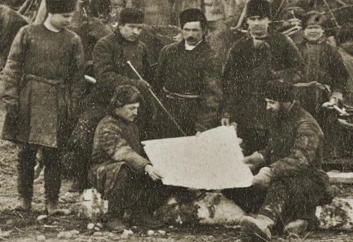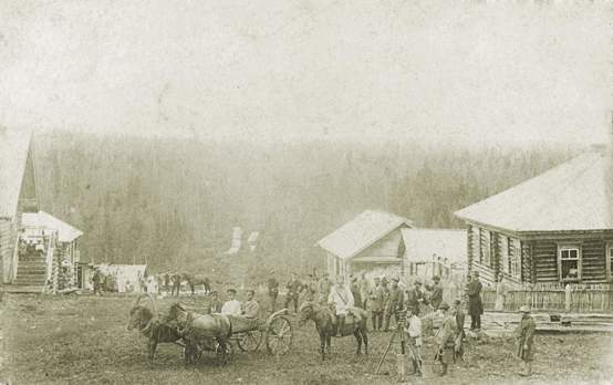 Рис. 19 Фрагмент фотографии Сергинского рудника. По данным Коми - Пермяцкого краеведческого музея справа за картой - заведующий Ужбургским районом, слева - штейгер, стоит в центре - маркшейдер